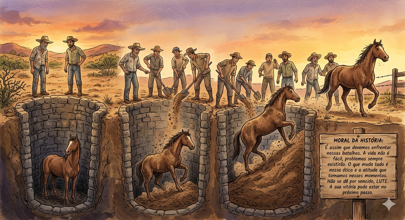 Um fazendeiro, que lutava com muitas dificuldades, possuía alguns cavalos para ajudar nos trabalhos em sua pequena fazenda. Um dia, o capataz veio trazer-lhe a notícia de que um dos cavalos havia caído num velho poço abandonado. O poço era muito profundo e seria extremamente difícil tirá-lo de lá.